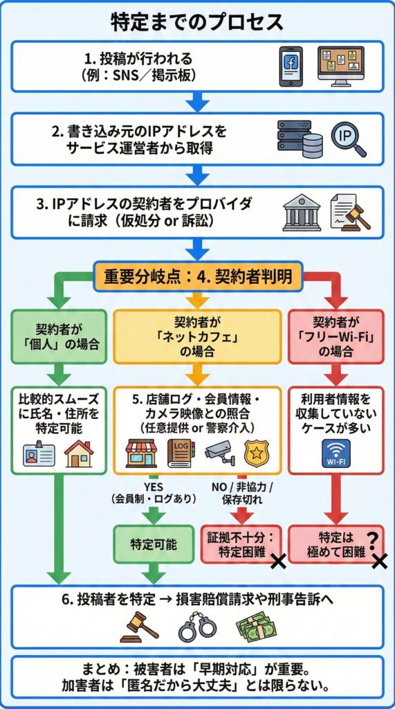 ネットカフェやフリーWi-Fiといった匿名性の高い環境からの書き込みであっても、投稿者の特定が現実に行われています。
